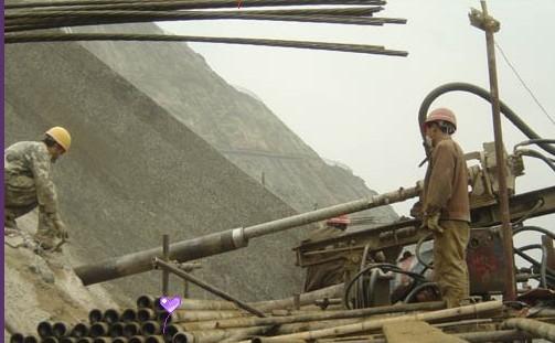 渗水的处理。在钻孔过程中或钻孔结束后吹孔时,从孔中吹出的都是一些小石粒和灰色或黄色团粒而无粉尘,说明孔内有渗水,岩粉多贴附于孔壁,这时,若孔深已够,则注入清水,以高压风吹净,直至吹出清水;若孔深不够,虽冲击器工作,仍有进尺,也必须立即停钻,拔出钻具,洗孔后再继续钻进,如此循环,直至结束。有时孔内渗水量大,有积水,吹出的是泥浆和碎石,这种情况岩粉不会糊住孔壁,只要冲击器工作,就可继续钻。如果渗水量太大,以至淹没了冲击器,冲击器会自动停止工作,应拔出钻具进行压力注浆。