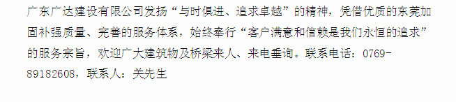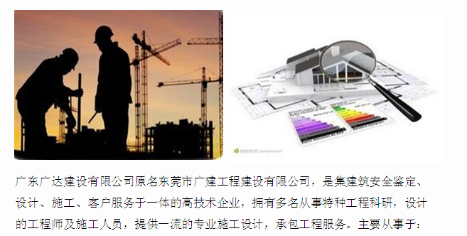 广东广达建设集团有限公司是国内知名东莞加固公司,主要面对东莞从事房屋桥梁加固补强,房屋安全鉴定以及基坑支护设计工程等业务,并为客户详尽提供东莞房屋安全鉴定,东莞基坑支护设计,加固补强,东莞市房屋鉴定,基坑支护,东莞加固等资讯及相关一体化服务口碑良好。